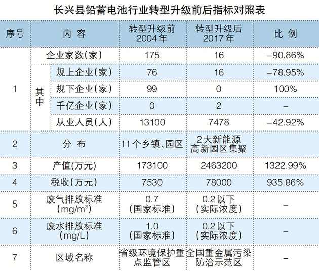 長興縣政府給記者提供的數(shù)據(jù)顯示,轉(zhuǎn)型升級前的2004年,長興鉛蓄電池企業(yè)數(shù)175家,其中規(guī)模以上企業(yè)76家,總產(chǎn)值17.31億元,稅收7500萬元;轉(zhuǎn)型升級后的2017年,長興鉛蓄電池企業(yè)16家,全部是規(guī)模以上企業(yè),總產(chǎn)值246.32億元,稅收7.8億元。2017年與2004年相比,產(chǎn)值增加超過13倍,稅收增長超過9倍。